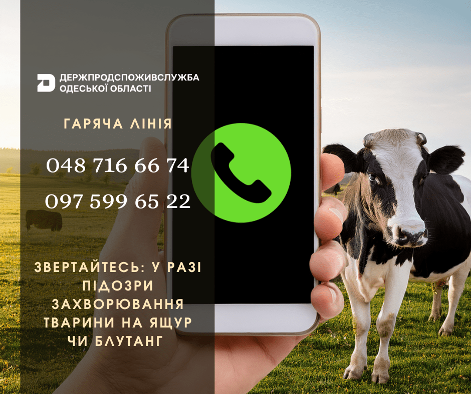 В Одеській області створено «гарячу лінію» для повідомлення про захворювання ящуру та блутангу (альтернативна назва: Є підозра, що тварина захворіла на ящур чи блутанг, – негайно повідомте на «гарячу лінію» Держпродспоживслужби Одещини)